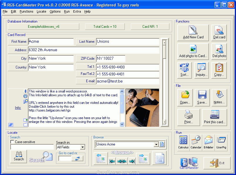 Has a security, inquiry, sort options, autodial feature, e-mail and web support, many print-options, Currency-calculator, print preview, calendar... You can do mailmerge with MS-Word using your addresses stored in RGS-CardMaster!