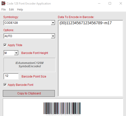 Easily generate Code 128 barcodes with IDAutomation's Code 128 Font Encoder Application Software, which allows users to copy and paste the Code 128 barcodes into other applications using the copy-to-clipboard feature. The Font Encoder Application allows the user to encode data and apply the IDAutomation fonts both in a graphical user interface or by using command-line parameters. Users can also create multiple barcodes using the import and export features included in the app, as well as, using command line options with specific parameters set instead of the GUI interface. With this Code 128 Font Encoder App, specialized barcodes such as SSCC-18, GS1-128, USPS EAN128, SICI and SISAC can be easily created.