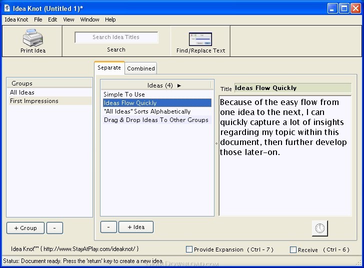 Idea Knot is a software tool designed to collect a library of inspired text ideas, each with a descriptive name of your choice, inside a special XML document. Its particular method of collection offers you two primary advantages over other text tools: 1) Instant access while inspired; 2) Reuse relevant ideas in different combinations.
