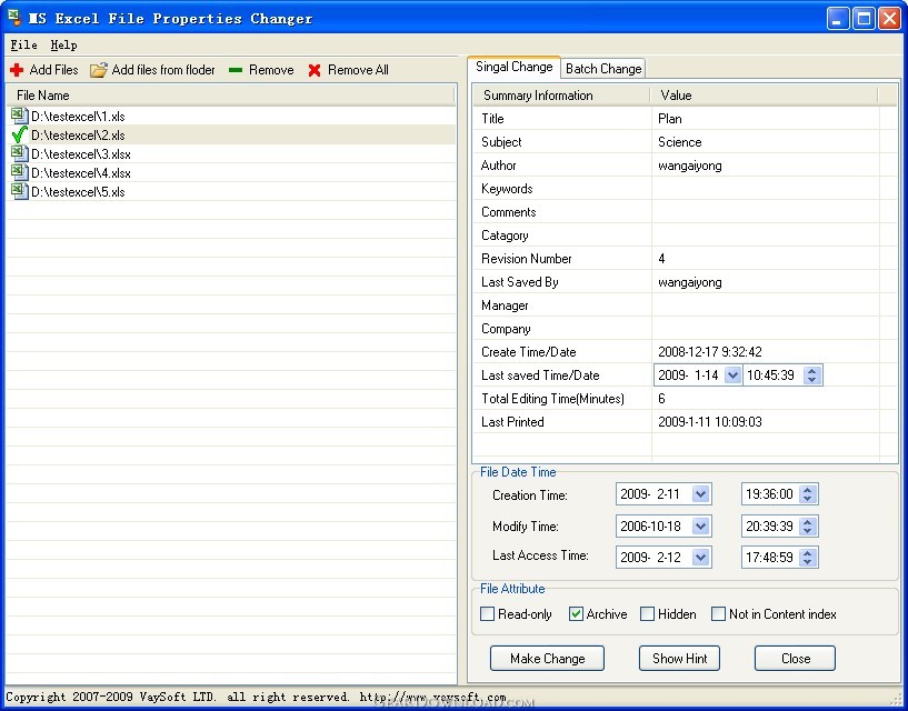MS Excel File Properties Changer - Modify MS Excel file properties: summary,date-time stamps and attributes