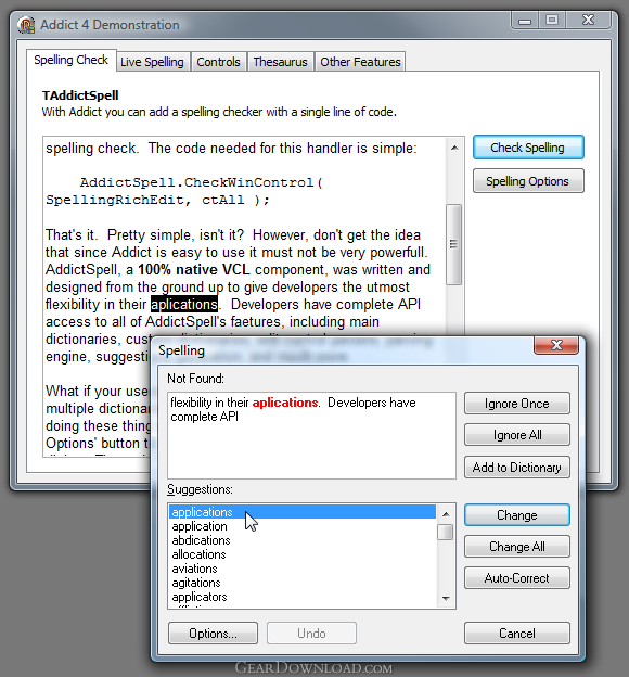 Addict is a native VCL component suite that provides end-to-end solutions for adding spelling check and thesaurus support to your Delphi and C++ Builder applications. With Addict you can add wavy red underlining of misspelled words and automatic corrections as you type to edits, memos, rich edits, and many of the most popular 3rd party controls available. Addict has extensive dictionary support currently at 22 languages and counting with many additional specialized dictionaries. The latest version of Addict has been built on over a decade of experience in the market delivering high quality spelling and thesaurus component software for every version of Delphi since 1.0. New features include support for Delphi and C++Builder 2009 and 2010, new and improved UI for spelling and configuration, greatly improved phonetic suggestions, full Unicode support and backwards compatibility with Addict 3 for easy upgrades.