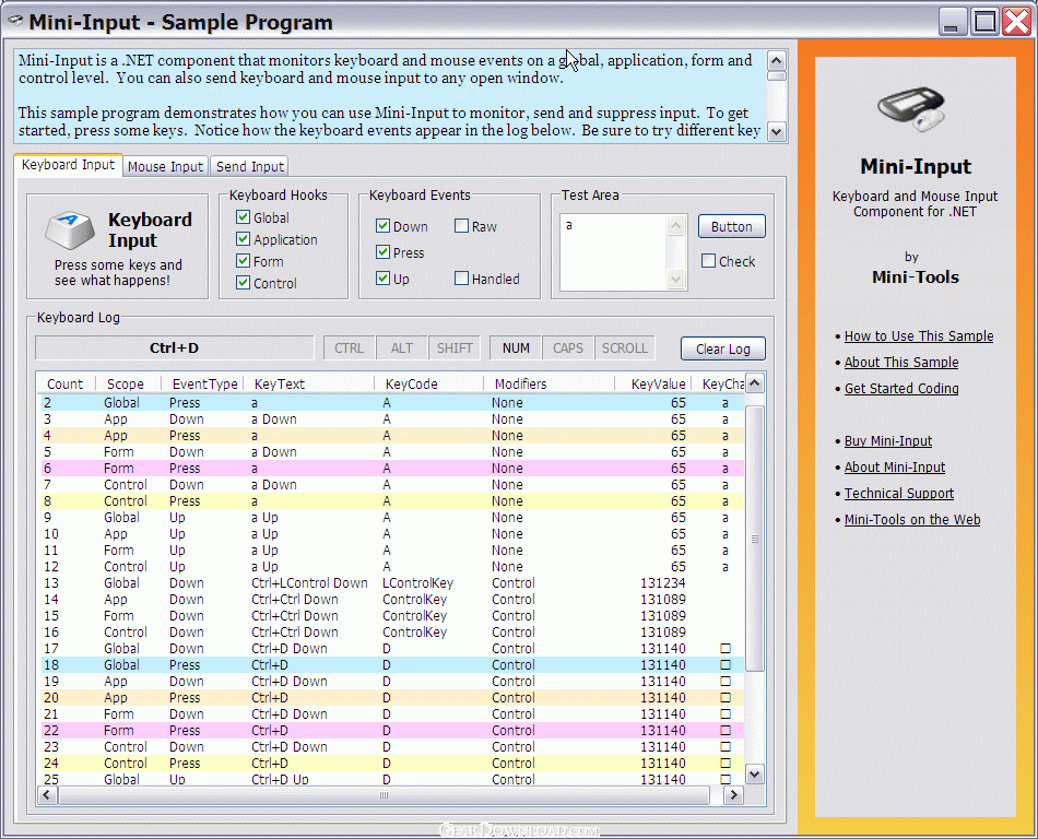 * Mini-Input enables you to monitor, suppress and send (Pro edition) keyboard and mouse input in one convenient .NET component.
