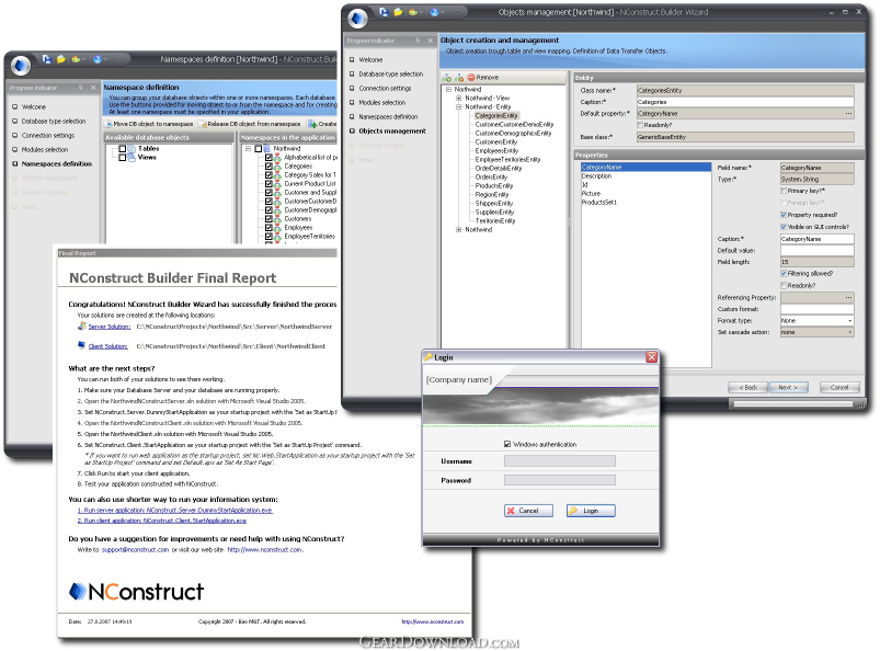 NConstruct Builder creates robust and scalable application servers which can work as standalone applications or as a Windows Service, and Windows client applications with a .NET Remoting connection to application server. The NConstruct Builder's wizard procedure creates and compiles two Microsoft Visual Studio 2005 solutions with full source code and supplementary libraries.*