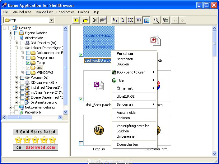 The ShellBrowser component set gives a programmer easy access to the Win32 shell functionality. The JamShellList, JamShellTree and JamShellCombo components look and behave exactly like the corresponding parts of the Explorer. All components support the properties page, correct icons, OLE Drag&Drop, the Explorer context menu and Unicode. A thumbnail component displays the Explorer thumbnail images. Interesting sample projects and help file with a lot of sample code are included. The registered version of the ShellBrowser Components is royalty free.