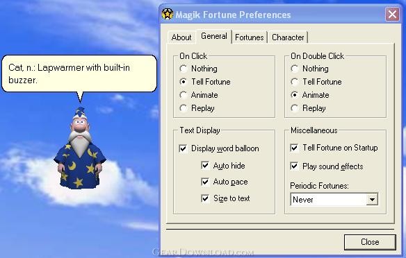 MagikFortune is extremely easy to use. We recommend when you install to configure MagikFortune to run on startup, that way a fortune is just a click away. MagikFortune can be configured to deliver fortunes on demand, at regular intervals, or whenever you log in. The rest of the time your character will simply amuse themselves and not disturb you. If you'd rather not even see your character they will happily disappear and hide in the system tray on the bottom right of your screen, out of sight but hopefully not out of mind.