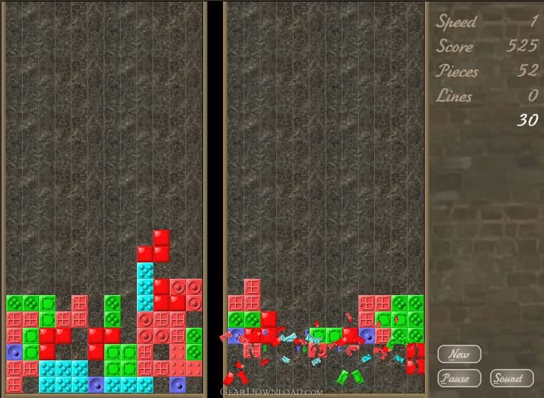 At first glance, the idea of the game may seem the same as Classic Tetris; to fill the horizontal lines of the game pits with the falling pieces. The more lines you fill, the higher the score. The falling figures may be made up of one, two or three little squares. Looks easy, right? But in this game there are two pits and you must maneuver two figures which move the same way! You can rotate or move the figures to the right and to the left but they will both make the same movement. And if the drop down of either figures is blocked, the second one will fall. So for your game to be successful you should plan carefully, or otherwise both pits will be quickly filled up. After you have dropped the figures down you can still move them to fill the empty spaces as they fall. If at least one new figure appearing at the top covers another figure that is already in pit, the game is over. As you can see, this is much more difficult than Classic Tetris. Below the line displaying the number of filled lines you will see your points for the current figures. Before a new pair of figures appears this number is added to your total score. The higher is the speed of the game, the higher the number. The faster you think, the more points you score. The game contains music, sound effects and photorealistic true color graphics.