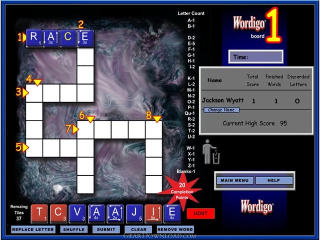 Wordigo is the popular board game that's now in 950 stores across the country. It's a combination of a spelling game and a crossword puzzle. If you like word games, you'll love Wordigo. You can replay the same puzzle over and over with new words each time or pick from a variety of different puzzles to play. You can also select from three levels of difficulty -- easy, medium and hard. Timed Mode is a fast-moving race against time, where you must complete the puzzle before the clock runs out. Or play without a timer at your own pace.
