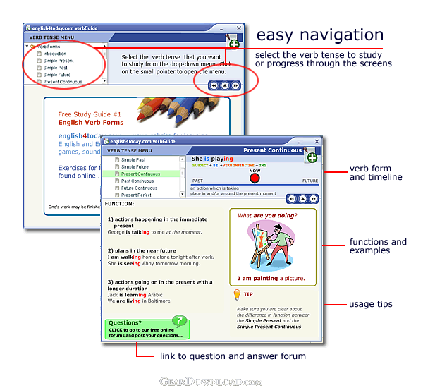 Free English4Today studyGuide: Number 1 in the series with more than 2000 downloads per week! Guide to English language verbs and tenses with optional online support materials and exercises. Part of a series of free studyGuides developed by English4Today.com for school, college,university and EFL students. Easy navigation and very simple install and uninstall. Covers all of the main English verb forms with examples and illustrations. An ideal study companion.Free updates from the website and free access to other English4Today studyGuides.