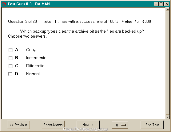 TestGuru is a free educational/testing software written in TCL/TK. TestGuru allows you to create your own quiz or sample exam in order to test your knowledge or skills. You can create your own custom tests or download samples from testing sites on the Internet. TestGuru is written for the Win32 platform but can be adapted for Linux/Unix platforms. A Win32 binary is provided courtesy of FreeWrap.