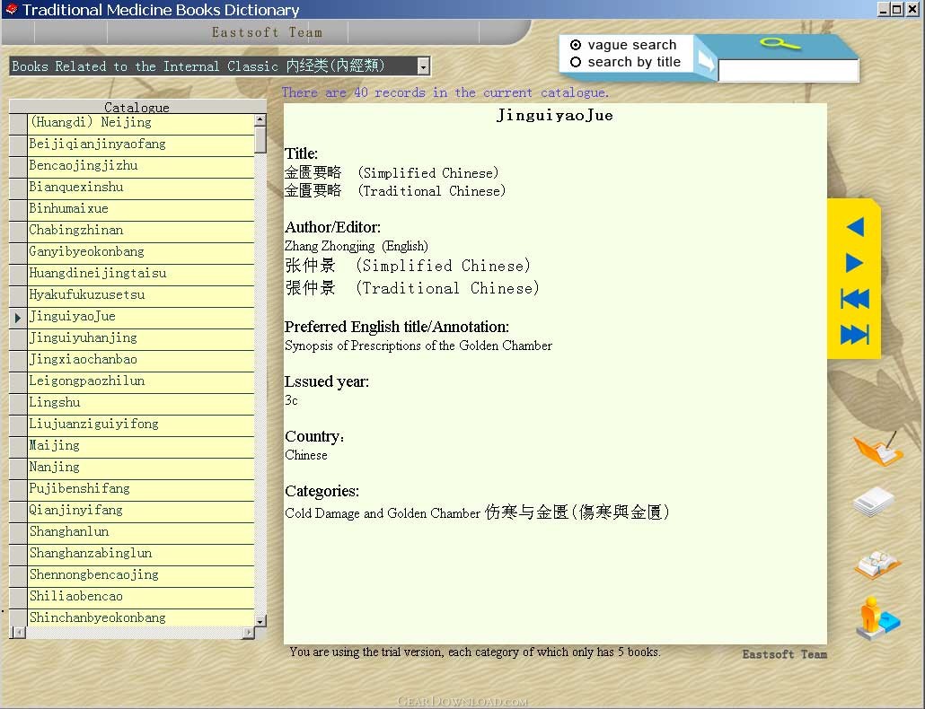 Traditional medicine books dictionary has collected more than 150 ancient medicine books' brief introduction in China, Korea, Japan, Vietnam, etc. It has 8 classified catalogues, whose names are translated according to the newest specification of WHO. And each book has the aspects of Author/Editor, Preferred English title/Annotation, Issued year, Country, Categories and so on, and it can be supported by English, simple Chinese and traditional Chinese.