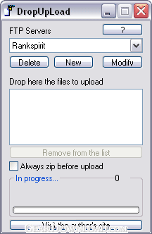 DropUpLoad is a very light, simple, strong and usefull Upload spooler for FTP management. It goes over connection errors and finish the job even in pretty bad conditions. No installation required. Copy the DropUpLoad.exe file on your disk and double-click on it.
