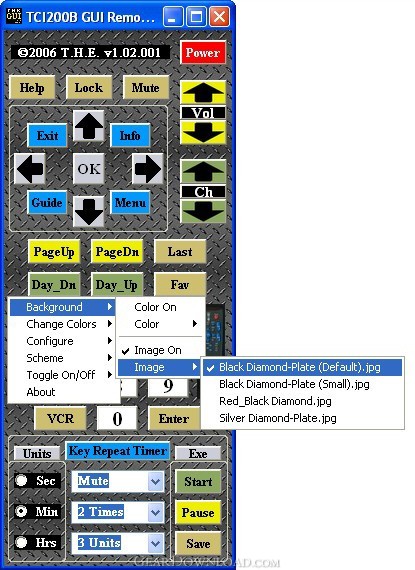 The TCI200B GUI Remote Control sits on the desktop of a windows computer. This freeware sends IR signals to a Motorola DCT2000 series receiver (or General Instrument DCT2000 series receiver) via a USB-UIRT (Universal Infrared Receiver Transmitter). One unique feature of all T.H.E. GUI Remote Controls is the "Key Repeat Timer" which gives you the ability to set the Timer to Repeat any Key programmatically. "Key Repeat Timer" Example: Select Key=Mute; Repeat=2 Times; Timer=3 Units; Units=Min. Click Start and the receiver mutes the TV for 3 minutes. Just enough time to miss those annoying commercials. Features: Key Repeat Timer - Repeat any of the 35 Keys upto 300 Times with intervals ranging from 1 second to 960 hours. Colorized Keys - Choose from 10 different colors for each of the 46 controls. Background Color - Set the background to any of the 16,581,375 colors from 000000 (Black) to FFFFFF (White). Background Image - Set the background to any image you can upload to your computer. Signal Repeat - Adjust the number of times your USB-UIRT sends a signal (from 1 to 9) each time a key is pressed. And more. See Screenshots Page: http://www.the-gui-automation.com/screenshots.html