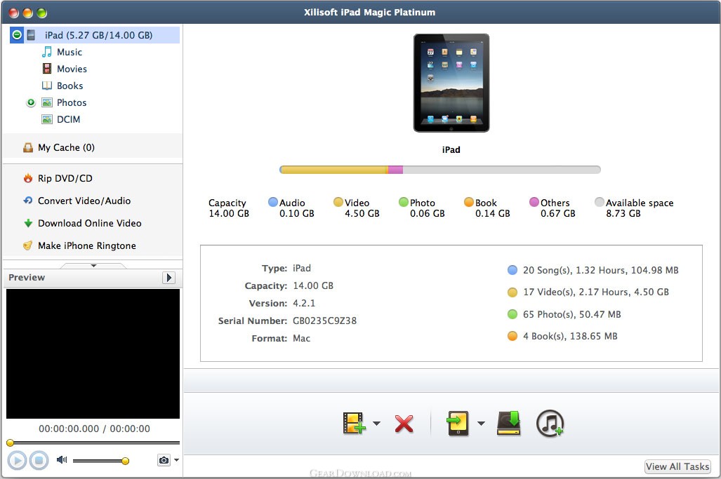 Xilisoft iPad Magic Platinum for Mac is designed for Mac and new Apple iPad tablet fans to backup your favorite movies and music on your Mac to iPad and transfer iPad contents to Mac as well. Also, it is possible to transfer iPad music and movies to iTunes. Apart from transferring iPad files, Xilisoft iPad Magic Platinum for Mac is also an iPad converter to help you rip CDs/DVDs to iPad, convert videos and audios on Mac to iPad supported formats, make iPhone ringtones from any video/audio file and download online videos with the built-in web browser.