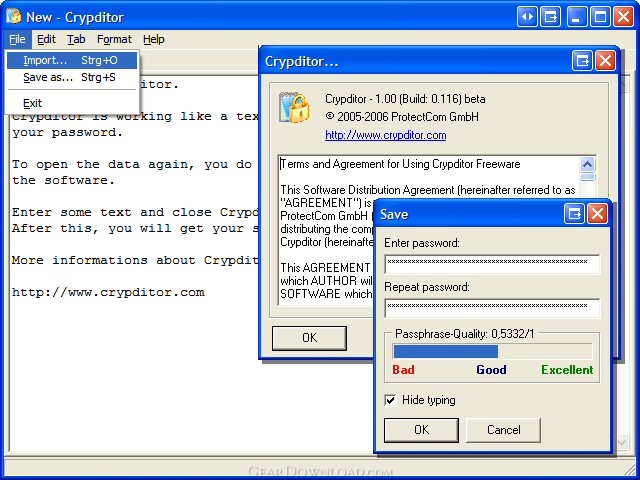 Cypditor is a text editor to save data with a high-secure encryption algorithm (AES). No other software needed: application and documents are in one, beacuse the mechanism to encrypt and decrypt the text files is part of it. No installation required! Simple but secure: Write your text or import your existing textfiles (tabbed working is supportet) within Crypditor and save the file. Double-click at the file and enter your password: access again. Security: Your informations will be encrypted using a password and most modern AES 256bit encryption technology. Innovative: a implemented Password-quality-check shows, how much secure your password is. Crypditor is designed to store your serial numbers, passwords, phone numbers and notes fast and simple in a safe place.