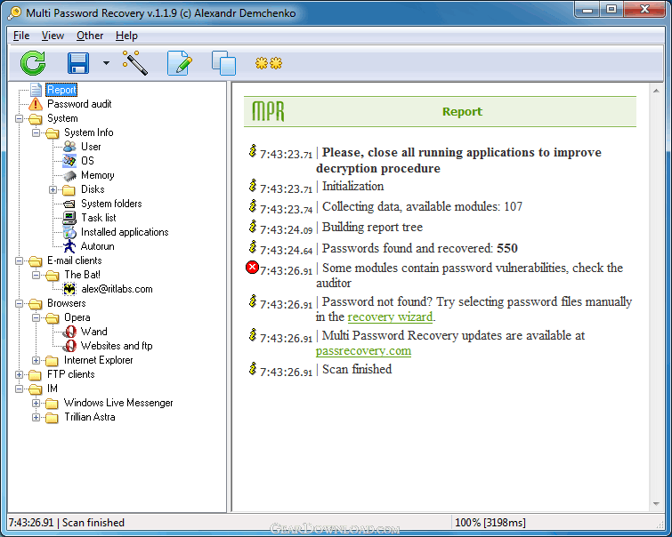 Multi Password Recovery (MPR) - multifunctional password recovery and auditing solution for Windows. MPR instantly finds and recovers passwords from more than 100 popular applications (FTP, E-mail clients, Instant Messengers, Browsers and so on). It also checks saved passwords for vulnerabilities, can delete lost and stored passwords, shows passwords hidden behind asterisks, copies SAM file, can generate new passwords.