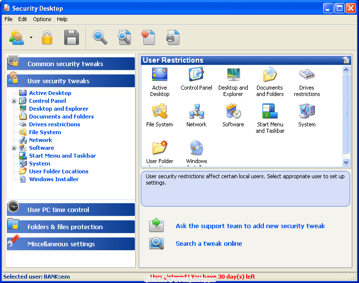 Security Desktop is a security utility that allows you to restrict access to Windows important resources. This utility limits kids time they spend in internet and playing games. It has got a number of options to customize the viewing and usage of a users Windows settings. Including hiding the desktop and start menu items, restrictions on the Active Desktop and much more. Also it provides folders and files protection. Security restrictions can be applied universally or just to specific users because Security Desktop Tool has got the multiuser intuitional interface.
