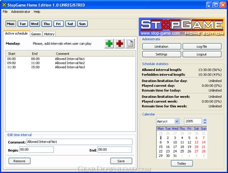 StopGame is an ideal computer program designed to help parents control the time their children spend playing computer games. The same of course applies to employers wishing to put a stop on the time their employees waste playing computer games on the job. Control is made possible by a set of intervals delimiting when a listed game may or may not be played. A time limit for play for each day or even for an entire week can also be set. StopGame will terminate any program from the "games" list that will attempt to break the rules you set yourself. You will be able to control anyone's use of the computer for games or any other applications even if you are not at home or in the office! New feature: add standart Windows games (like Minesweeper, Pinball, etc.) to the game list with one click!
