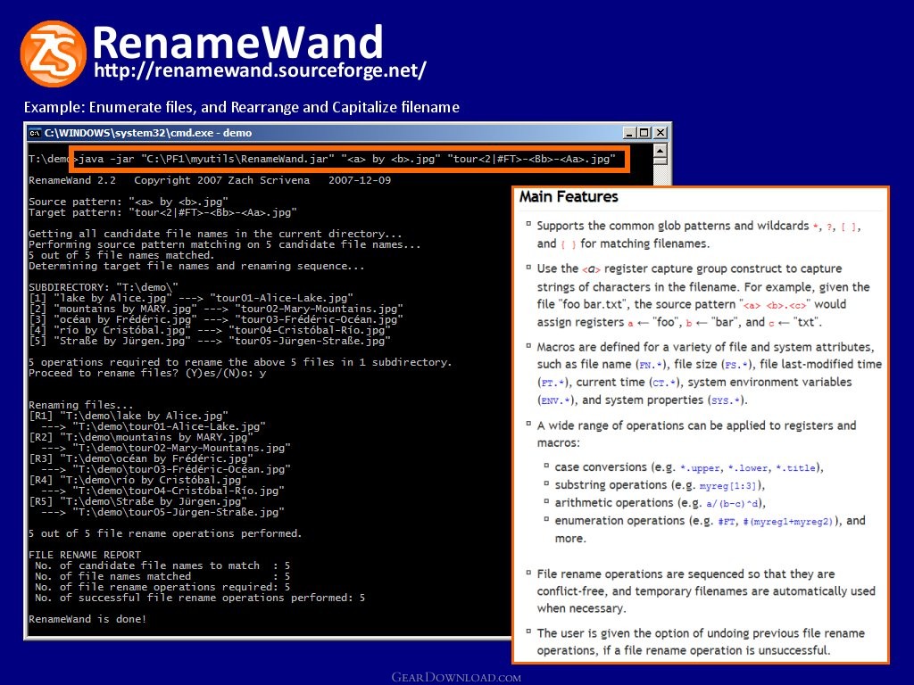 Perform string operations (e.g. case conversions, rearrangements of substrings), arithmetic operations (e.g. on the numbers in the filename), enumerate files (e.g. by name, size, time, or other attributes), insert timestamps, and many more file and system attributes with ease!
