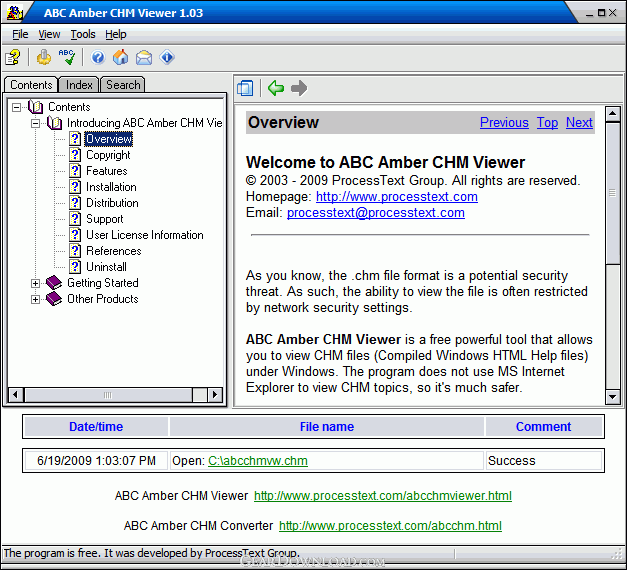 ABC Amber CHM Viewer is a free powerful tool that allows you to view CHM files (Compiled Windows HTML Help files) under Windows. The program does not use MS Internet Explorer to view CHM topics, so it's much safer.