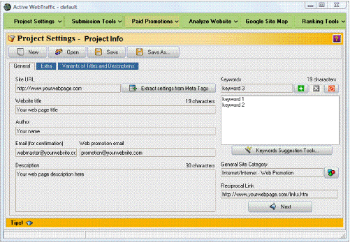 Active WebTraffic is a professional web promotion software that includes everything you need to submit, position and promote your website to search engines and internet directories. This popular software includes a complete set of innovative tools that cover all the web promotion processes in 5 easy steps: