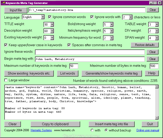 In contrast to freeware keywords meta tag generators, which require *you* to select keywords, this program scans an HTML or PHP file, counting the number of occurrences of words and how they are used, and produces an appropriate keywords meta tag for the document. This can be inserted automatically into the file. The program ignores user-specified words and common words such as 'this', and the resulting keywords meta tag depends on user-specified weights assigned to boldface words, words within headings, etc. The program also ignores anything in the body of the file which is within HTML tags, within comments or within SCRIPT or STYLE tags so it can be used with HTML files which use cascading style sheets, have lots of embedded javascript or were generated by some WYSIWYG web page creator. Supports EM, STRONG, DIV and SPAN tags. The program works with HTML files in French, German, Italian, Spanish and Portuguese, as well as in English.